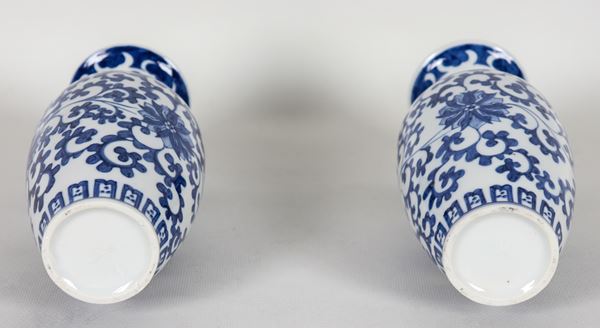 Coppia di vasetti in porcellana bianca con decorazioni in blu a volute floreali