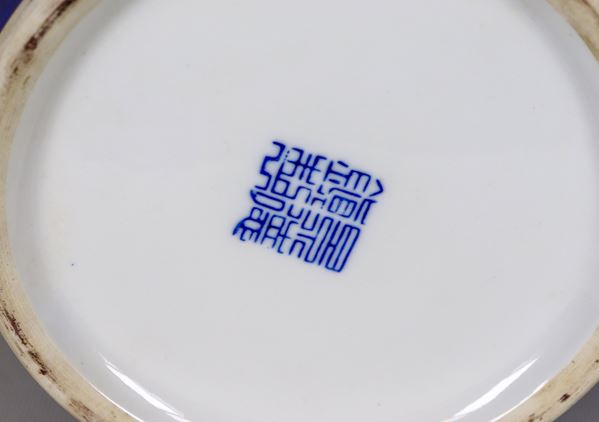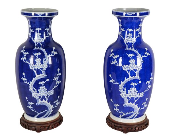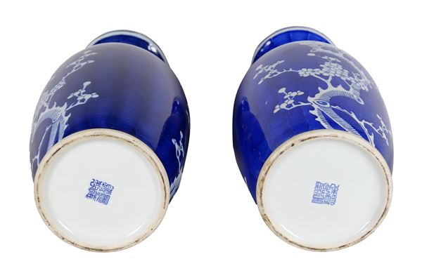 Coppia di vasi cinesi in porcellana blu decorati in bianco con rami di fiori di loto