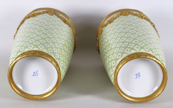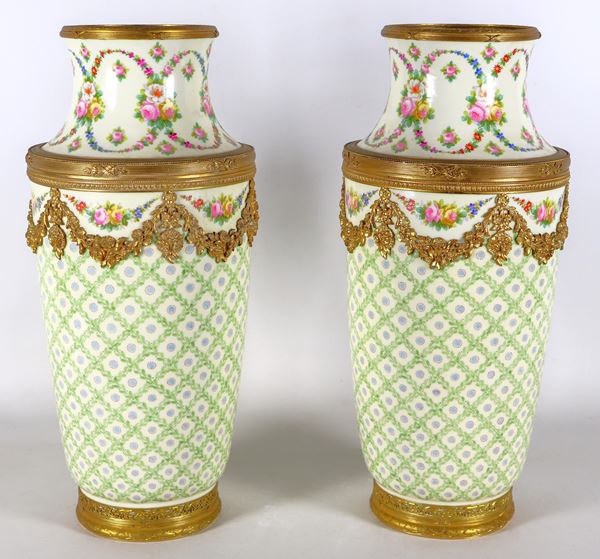 Coppia di vasi in porcellana di Sevres, con decorazioni policrome a motivi floreali e geometrici, guarnizioni e fregi in bronzo dorato e cese [..]