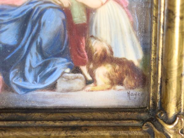 "Dama con figlioletti", piccola miniatura dipinta firmata, in cornicetta in legno dorato