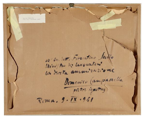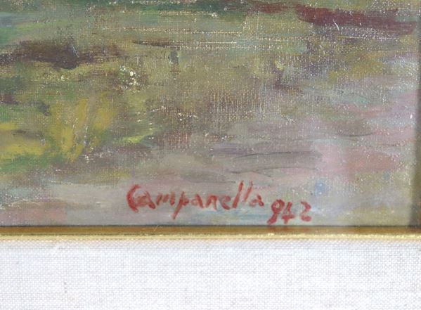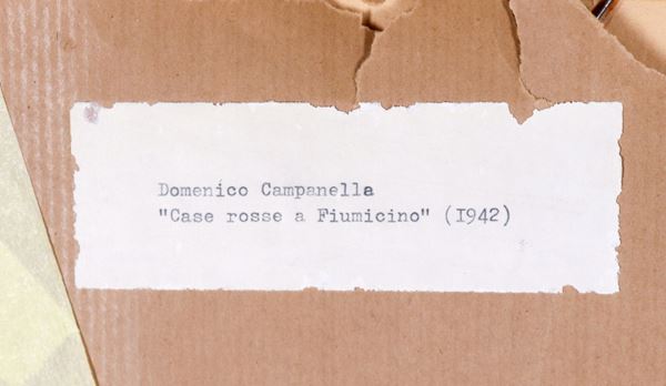 Firmato e datato 1942. "Case rosse a Fiumicino", dipinto ad olio su cartone pressato