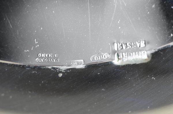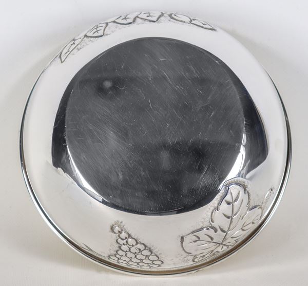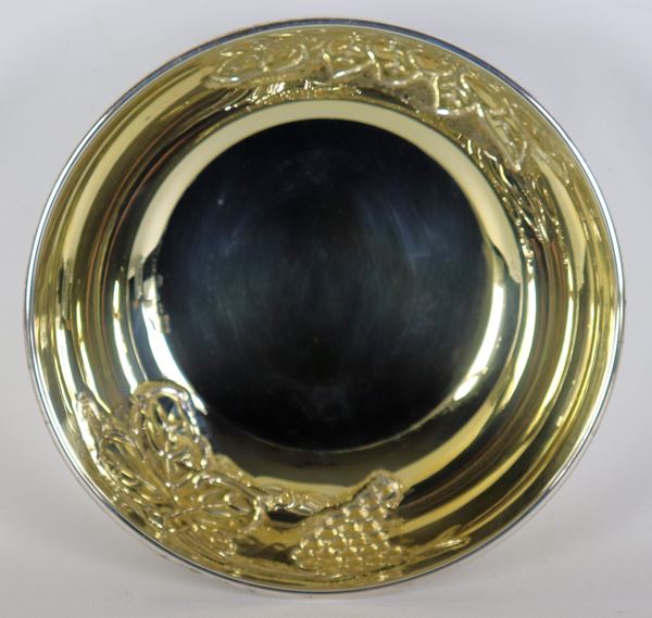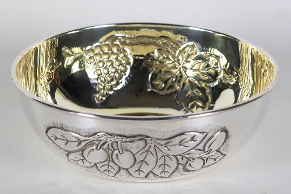 Fruttiera tonda in argento cesellata e sbalzata a rilievo a motivi di frutta, interno in vermeil, gr. 325