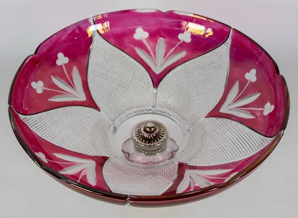 Fruttiera tonda in cristallo di Boemia color vinaccio lavorato a punta di diamante a foglie e fiori, base con guarnizioni in argento