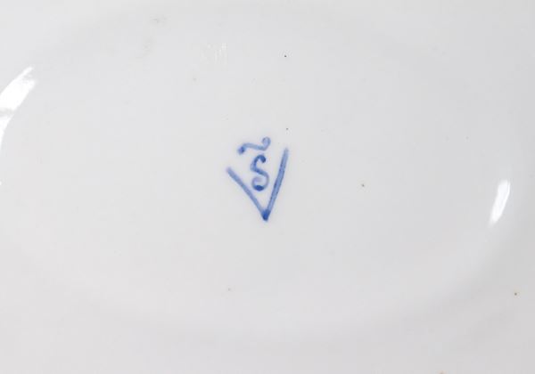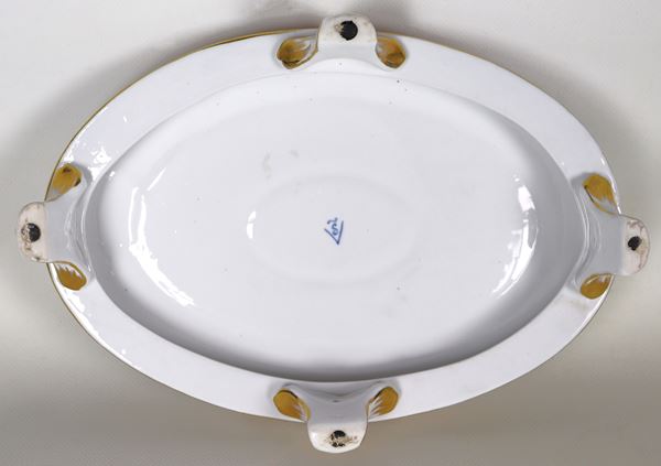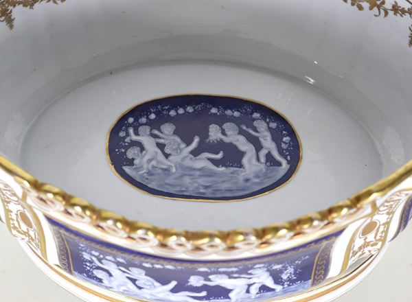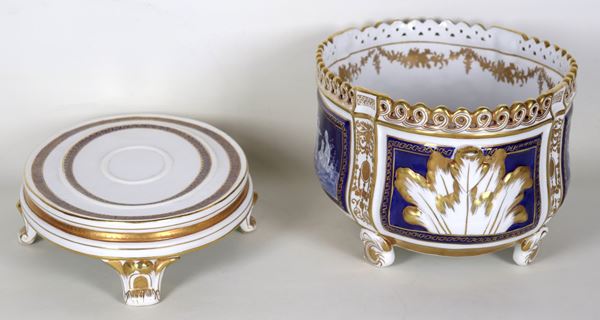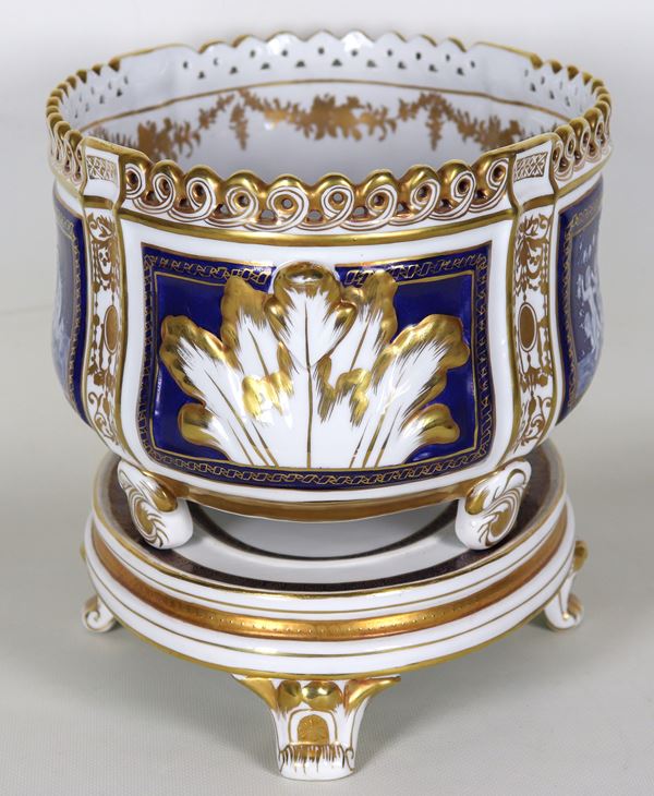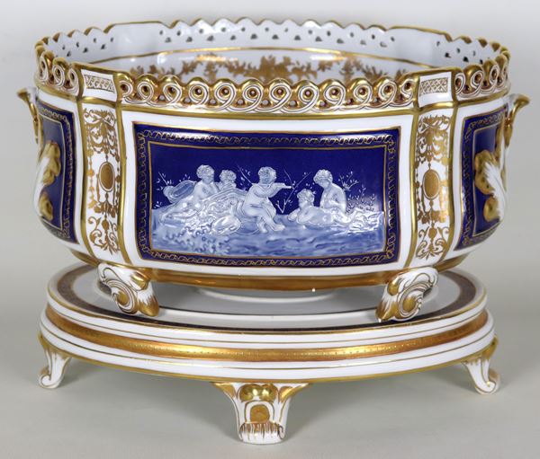 Giardiniera in porcellana francese con decorazioni neoclassiche a rilievo a motivi di "Allegorie di putti" e guarnizioni in oro zecchino, sorretta [..]