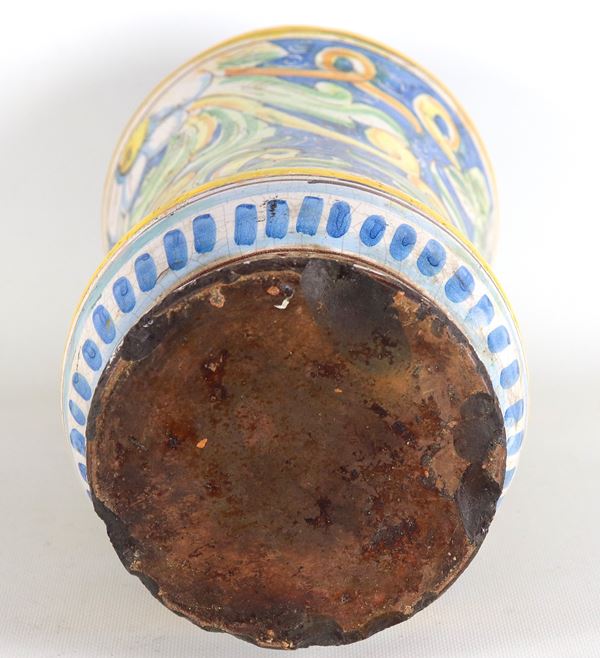 Grande albarello in maiolica siciliana, con decorazioni policrome a volute floreali su fondo blu. Difetti alla base