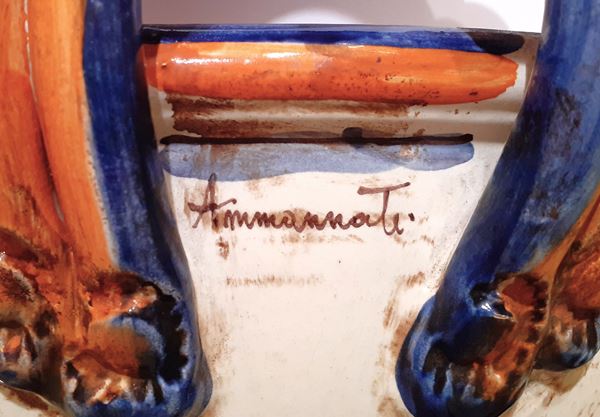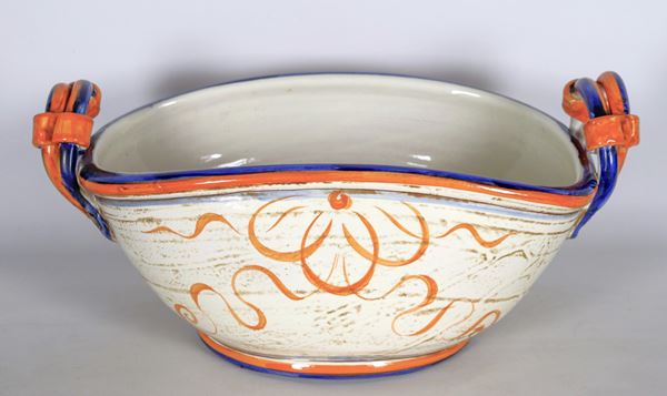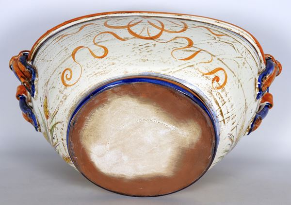 Grande cesto con manici in maiolica smaltata toscana, marcato Ammannati Ceramiche d'Arte Montelupo Fiorentino, con decorazioni policrome di [..]