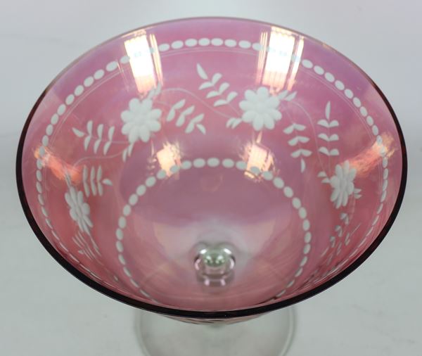 Grande coppa in cristallo color rosa antico inciso a motivi di fiori e cordoni