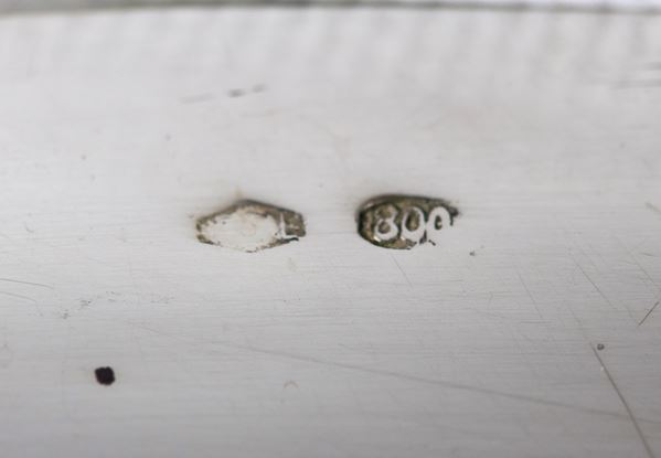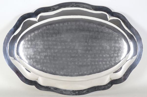 Grande piatto ovale da portata in argento con bordo sagomato e sbalzato, gr. 1330