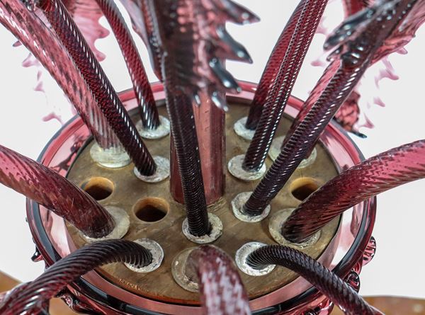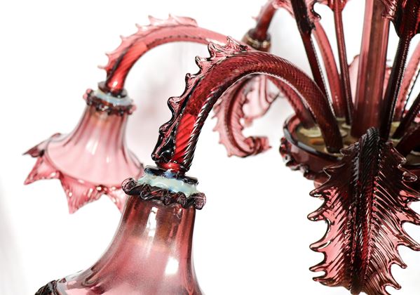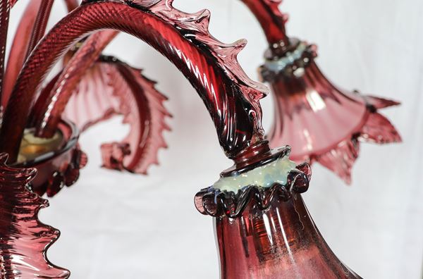 Lampadario in cristallo e vetro soffiato di Murano color vinaccio, qualche difetto e mancanza di due foglie piccole e una grande, 6 luci. Anni [..]