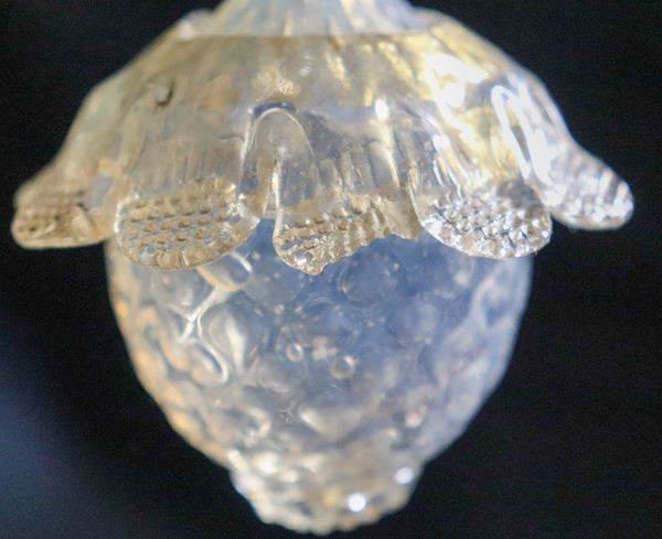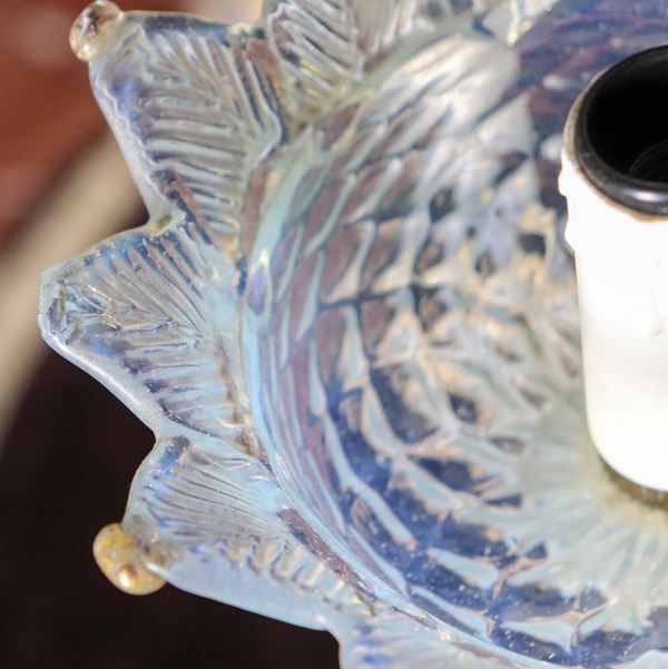 Lampadario in vetro soffiato di Murano con foglie e fiori, color lattice con riflessi celesti e profili dorati, 8 luci. Lievi difetti. Manifattura [..]