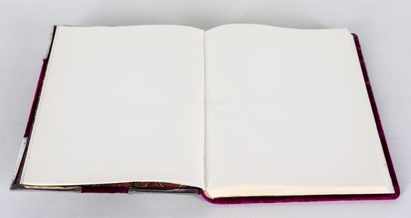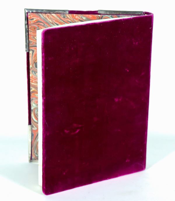 Libro commemorativo per firme, con rivestimento in velluto rosso porpora e applicazioni di antichi fregi in argento cesellato e sbalzato, con [..]