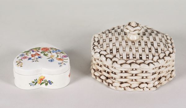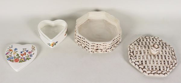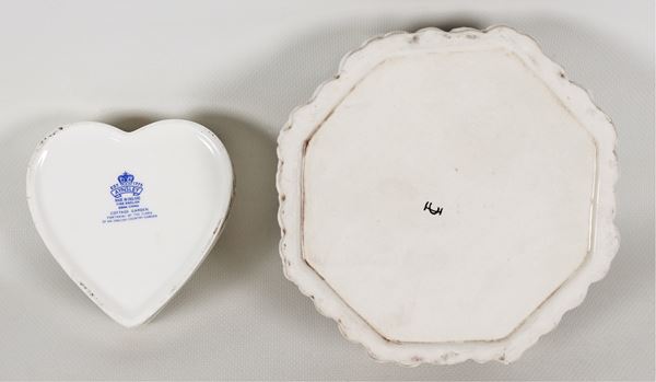 Lotto di due scatole, una a forma di cuore in porcellana inglese Aynsley con decorazioni smaltate di fiori e farfalle, e una a forma ottagonale [..]