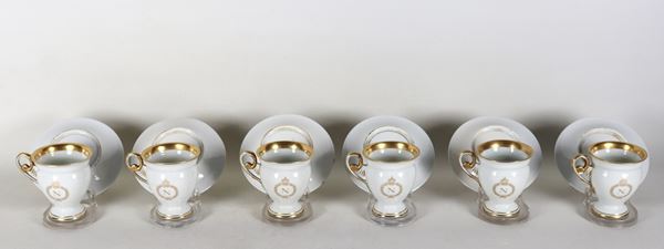 Lotto di sei antiche tazze con piattini in porcellana francese bianca e oro, con medaglioni dipinti raffiguranti personaggi napoleonici