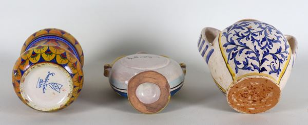 Lotto di una brocchetta, un albarello e un'anforetta in maiolica Gualdo Tadino e Caltagirone, vari decori e misure
