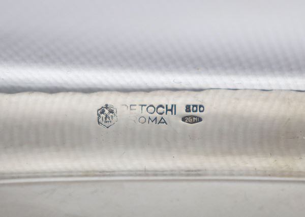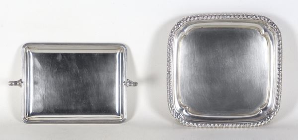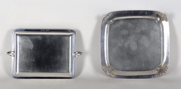Lotto in argento cesellato e sbalzato, di un piattino rettangolare con manici marcato Serra-Roma e un piattino quadrato sorretto da quattro [..]