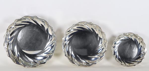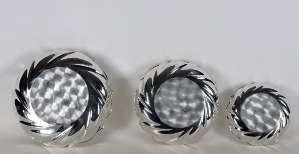 Lotto in argento di tre centrotavola tondi, cesellati e sbalzati a torchon, grandezze differenti, gr. 1245