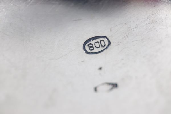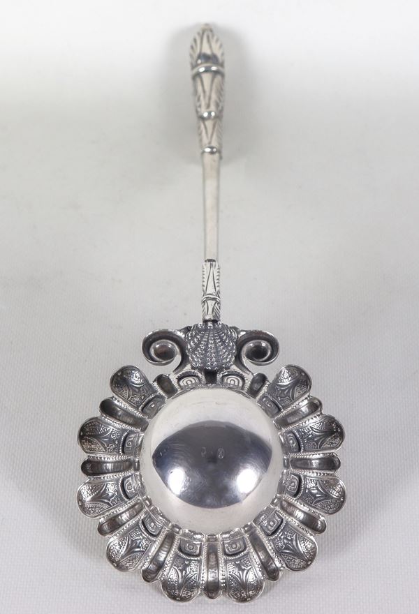 Mestolo in argento sbalzato e cesellato a motivi di foglie e gigli con manico ricurvo, gr. 300