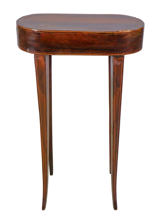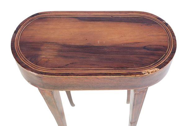 Modellino di gueridon francese Carlo X in ebano viola, a forma ovale con intarsi, quattro gambe ricurve e difetto al bordo del piano