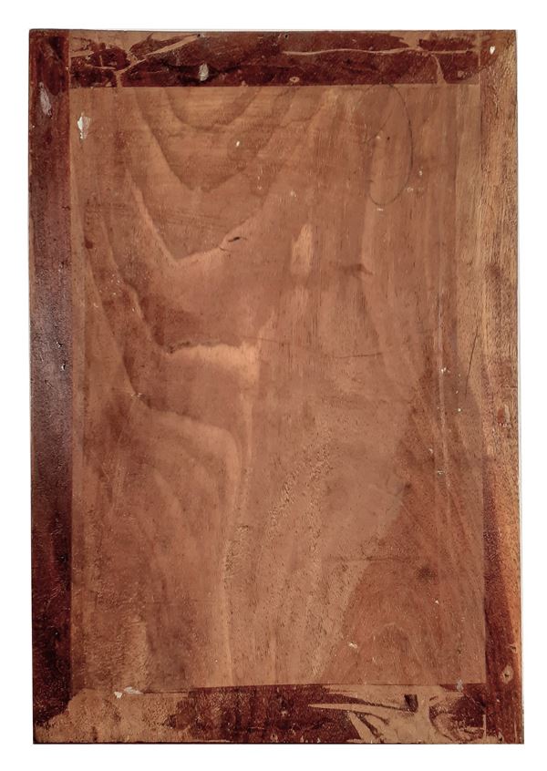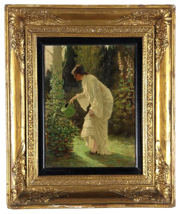 Firmato. “Ragazza che annaffia le rose”, piccolo dipinto ad olio su tavoletta