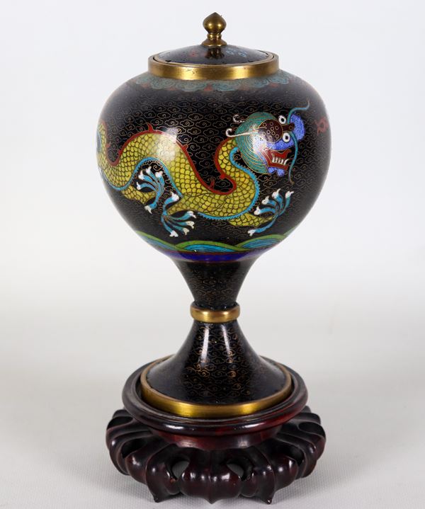 Piccola urna cinese a forma di vaso in smalto cloisonnè policromo, con decori a rilievo di draghi, annessa base in teak
