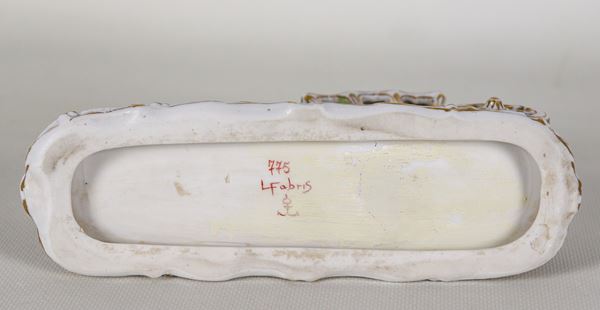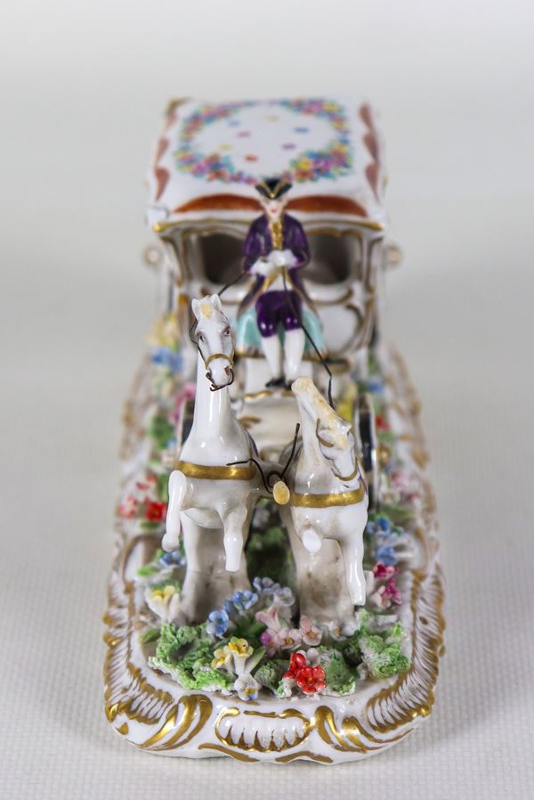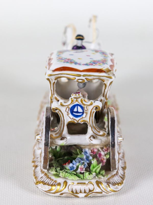 Piccolo gruppo in porcellana policroma "Carrozza con dama", marcato Luigi Fabris. Mancanze e difetti