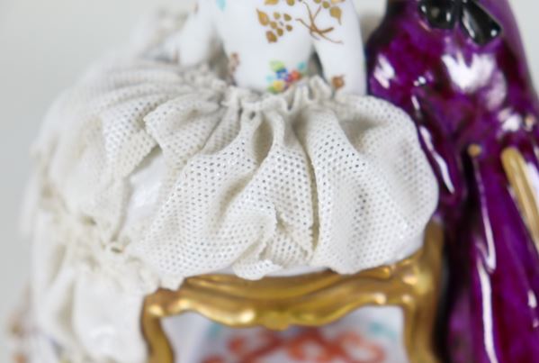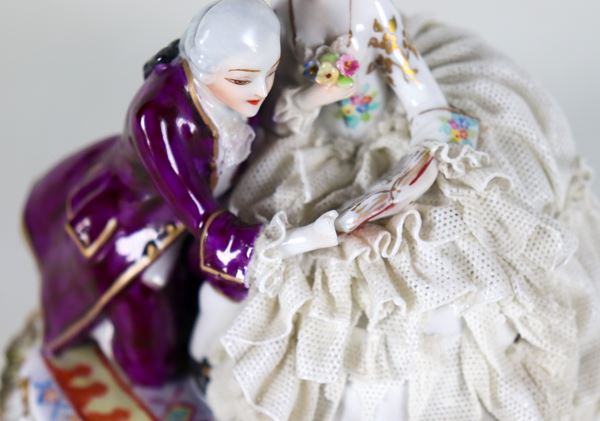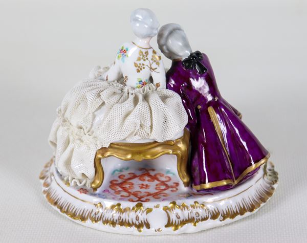 Piccolo gruppo in porcellana policroma "Scena galante", difetti e mancanze
