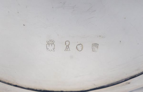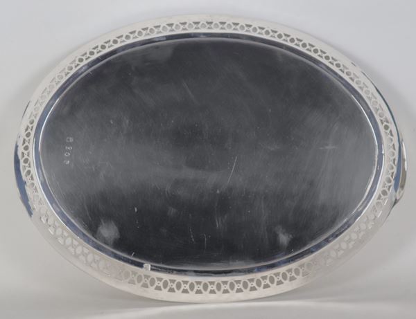 Piccolo vassoio ovale in argento cesellato e sbalzato, con bordo a ringhierina traforata e due manici, gr. 730