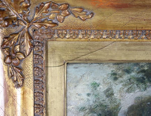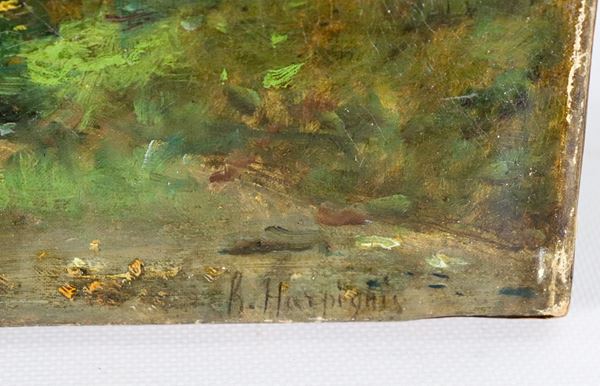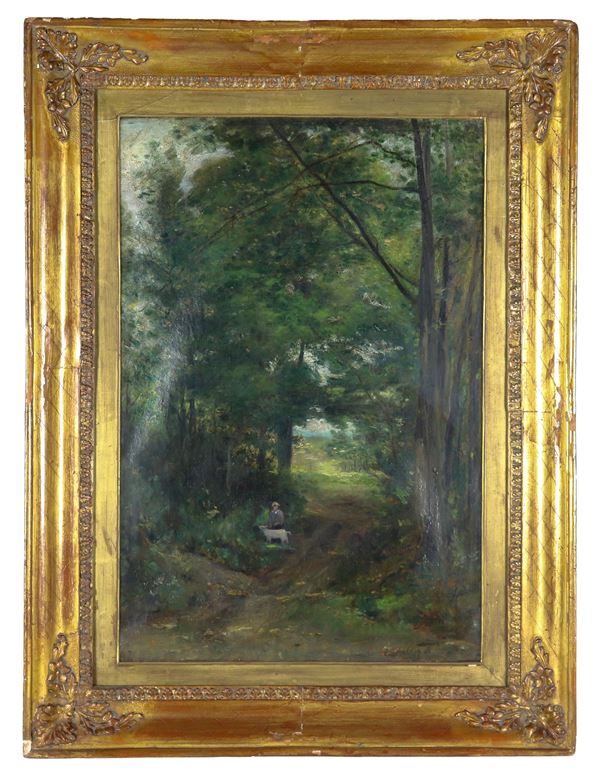 Firmato. “Bosco con contadina e capretta”, dipinto ad olio su tela