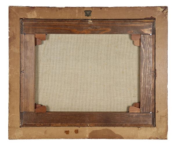 "Paesaggio con paese sul lago e barche di pescatori", dipinto ad olio su tela