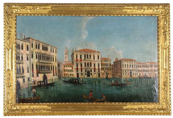 "Veduta di Venezia con il Canal Grande e gondole", luminoso dipinto ad olio su tela di ottima realizzazione pittorica