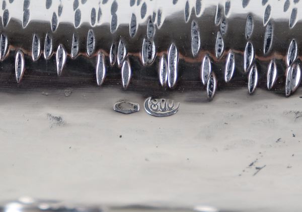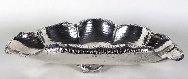 Portabonbon in argento a forma di conchiglia, sorretto da tre sculturine di pesci, gr. 395