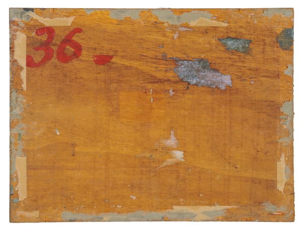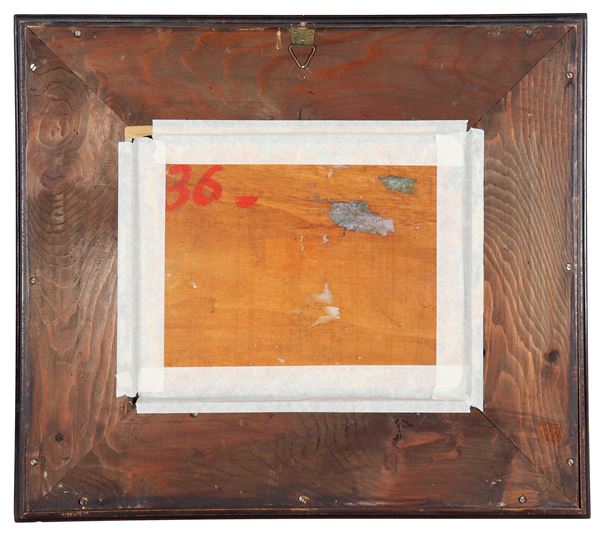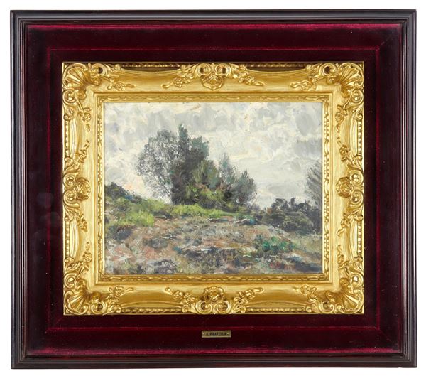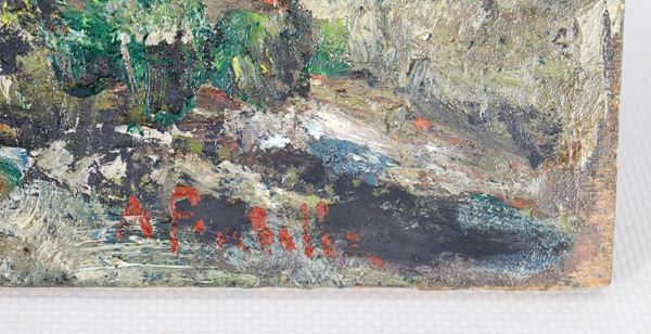 Firmato. "Paesaggio collinare con alberi", piccolo dipinto ad olio su tavoletta