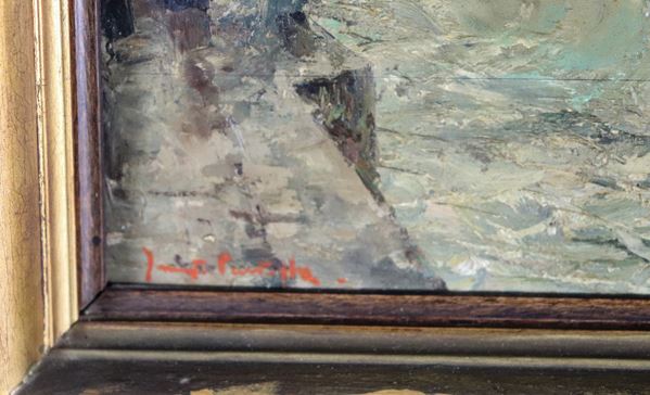 Firmato. “Marina con scorcio di porticciolo e barche di pescatori”, piccolo dipinto ad olio su compensato
