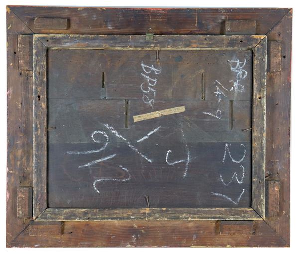 "Cavaliere con cane e veditrice di ortaggi", piccolo dipinto ad olio su tela