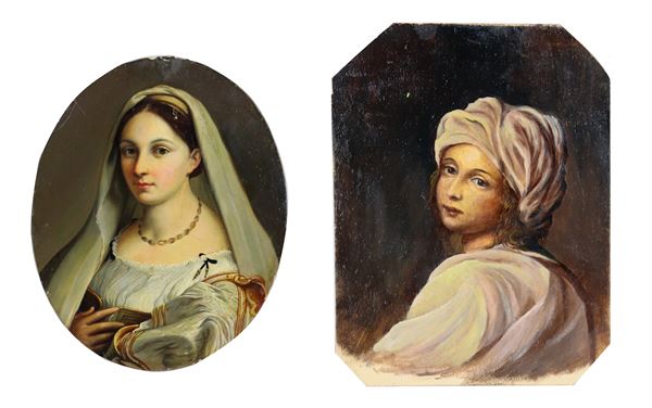 "Beatrice Cenci" e "La Velata", coppia di piccoli dipinti ad olio su compensato da soggetti di Raffaello