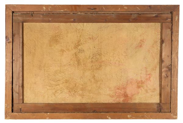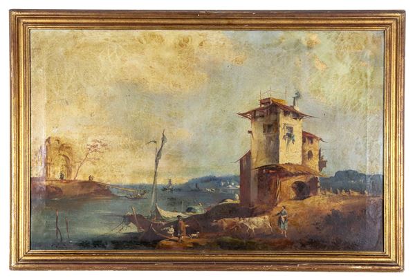 "Capriccio veneziano con veduta di porticciolo e personaggi", dipinto ad olio su tela