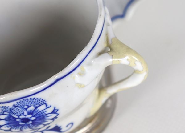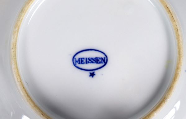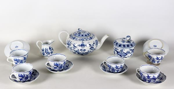 Servizio da tè in porcellana tedesca, marcato MEISSEN, con decorazione a disegno "cipolla" in blu su fondo bianco. Una tazza presenta difetto [..]