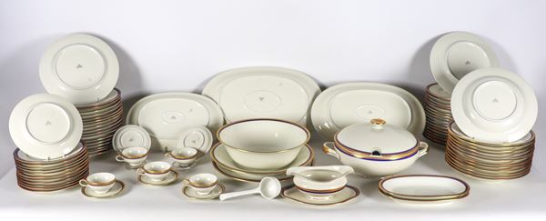 composto da: 13 fondine, 36 piatti piani, 12 piattini, 1 zuppiera, 1 insalatiera, 1 salsiera, 2 burriere, 2 piatti tondi da portata, 3 piatti ovali da portata e 5 tazzine da caffè con piattini.