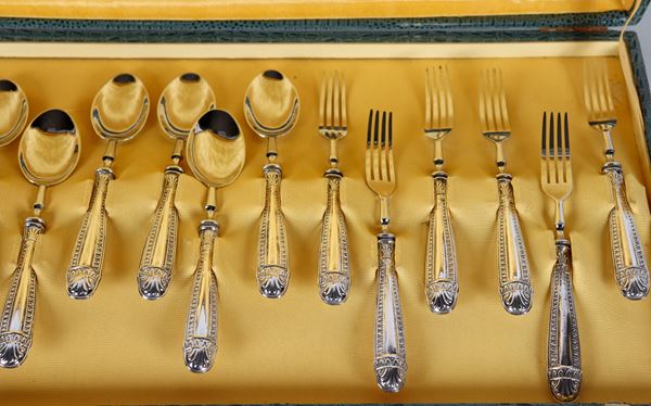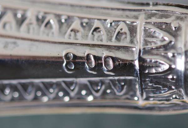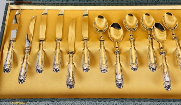 Set da dolce con manici in argento cesellato e sbalzato di sei coltellini, sei forchettine e sei cucchiaini (18 pz), annesso astuccio