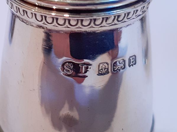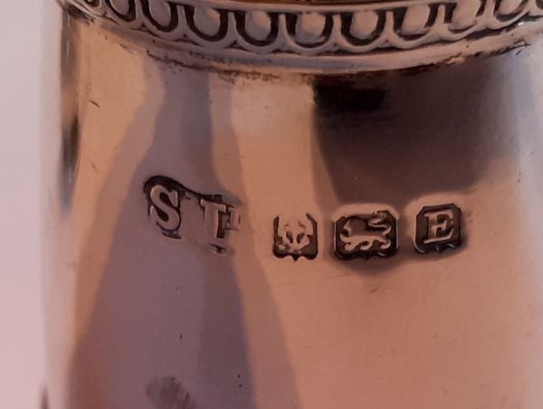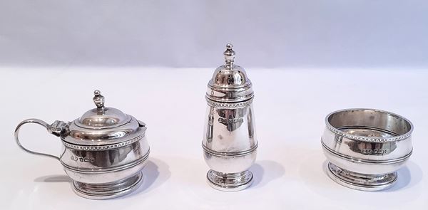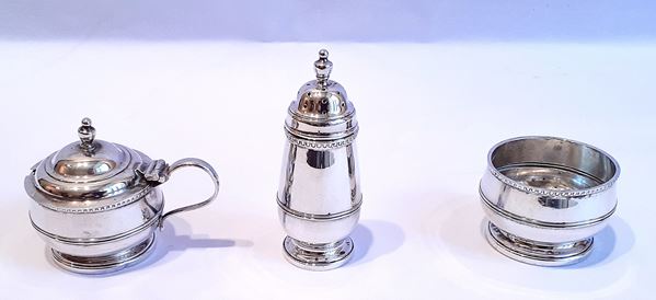 Set da tavola in argento cesellato e sbalzato Epoca Giorgio V: pepiera , saliera e mostardiera. Bolli Birmingham 1927, annesso astuccio originale [..]