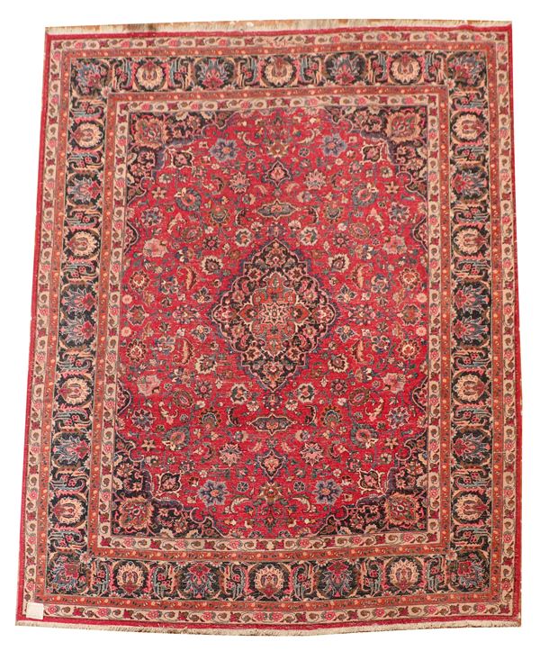 Tappeto persiano Kashan a disegno geometrico e floreale su fondo rosso, M 3,22 x 2,47