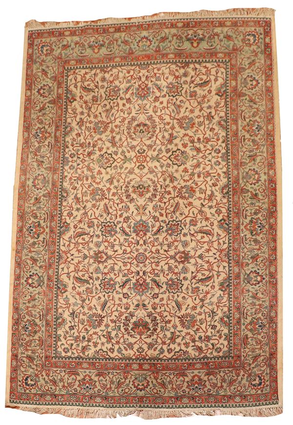 Tappeto persiano Zaranj a disegno geometrico floreale su fondo avana e bordo verde, M 2,68 x 1,64