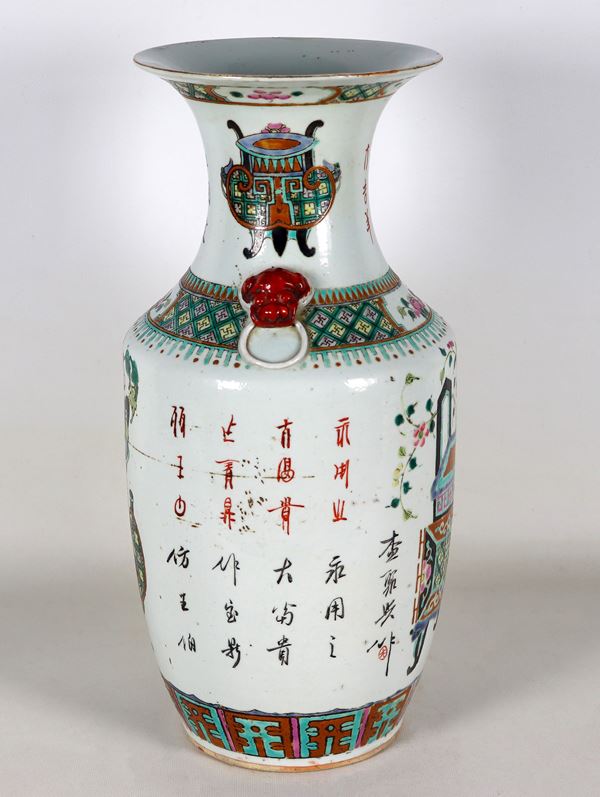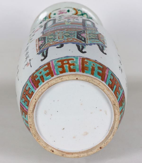 Vaso cinese a tromba in porcellana con decorazioni in smalti a rilievo a motivi di vasi e fiori