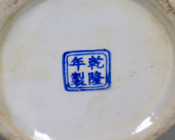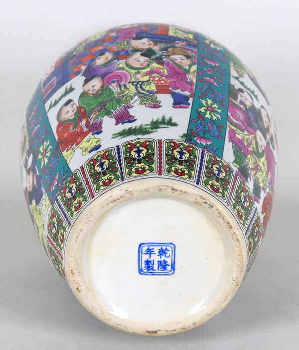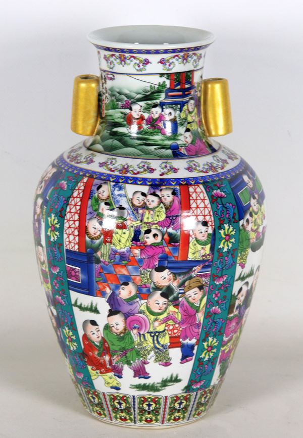 Vaso cinese in porcellana smaltata e decorata a rilievo con scene di vita orientale