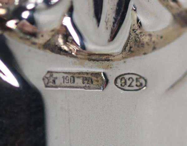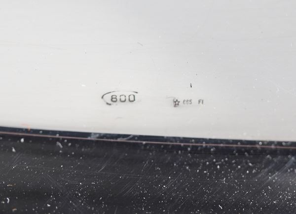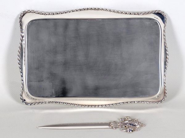 Vassoietto portaposta in argento cesellato e sbalzato con tagliacarte. Bollo del vassoietto Titolo 800, bollo del tagliacarte titolo 925 (2 [..]