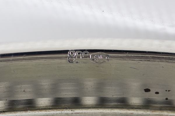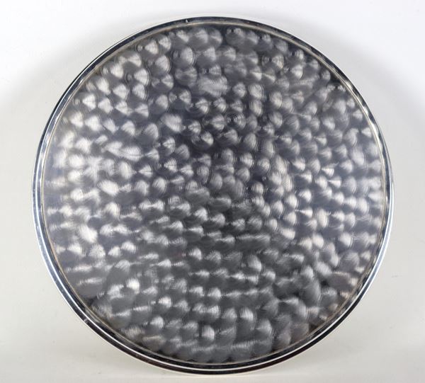 Vassoio tondo in argento cesellato e sbalzato con bordo a ringhierina traforata, gr. 720