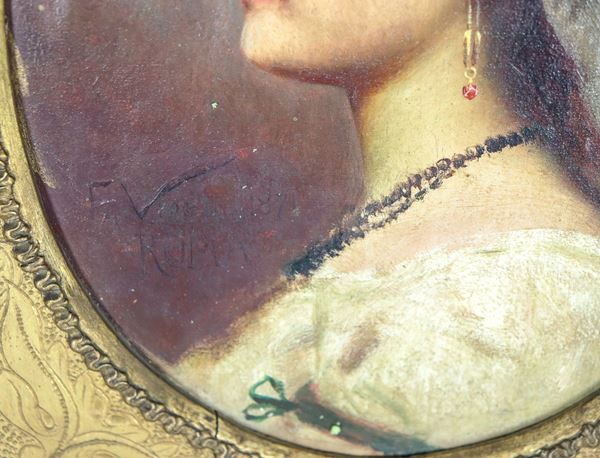 Firmato, iscritto e datato Roma 1871. "Ritratto di giovane ciociara", piccolo dipinto ad olio su tavola