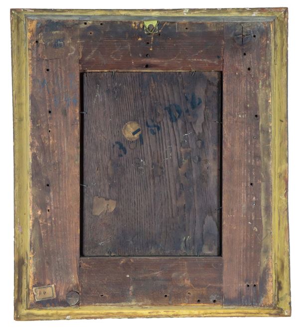cornice in legno dorato dell'epoca che presenta vari difetti, cm 26 x 19,5.