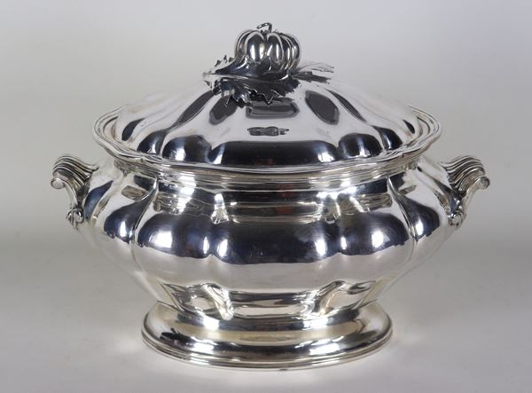 Zuppiera ovale in argento di linea Luigi XIV, cesellata e sbalzata con manici e pomo lavorati, gr. 2610