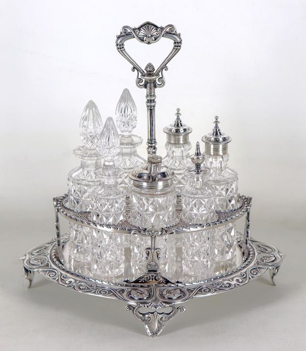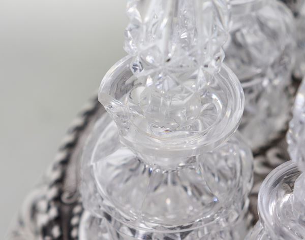 Antica cruet Epoca Regina Vittoria, in sheffield cesellato e sbalzato con tre ampolle, tre flaconi e una mostardiera in cristallo lavorato. [..]